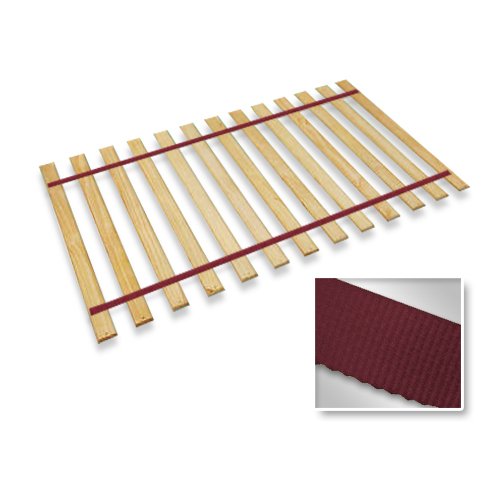 Bed slats eliminate the need for a link spring or box spring! They provide support so that you can use a regular mattress on a full size bed rather than having to use a specific bed mattress. Place them under your mattress on the bed frame and you are ready to go. The slats are 2 3/4" wide and are spaced 2 3/4" apart from one another. The slats are attached by 1" wide maroon straps.The slats are 54 1/8" (give or take 1/16") wide are attached to each other out to 75" in length. Be sure to measure your bed to ensure that these slats will fit before you purchase..../ Full Size Attached Bed Slats - Bunkie Boards (Maroon Straps) / platform beds